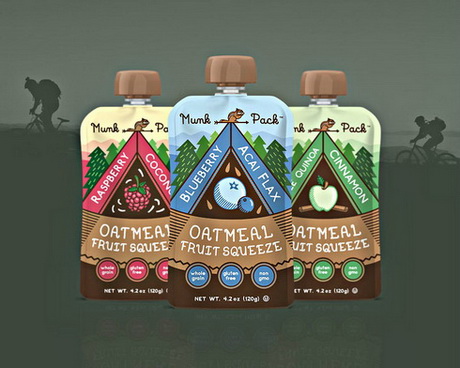 Продукция Munk Pack, разработанная дизайнерским агентством Motto, представляет собой снэк, обогащённый полезными веществами. Он предназначен для тех, кто любит проводить время на природе. Фруктово-зерновые снэки легко выдавливаются из упаковок дой-пак с удобным носиком, пишет Upakovano.ru. Упаковки оформлены в туристической тематике, а входящие в состав фрукты изображены в палатке, над которой сидит бурундук.