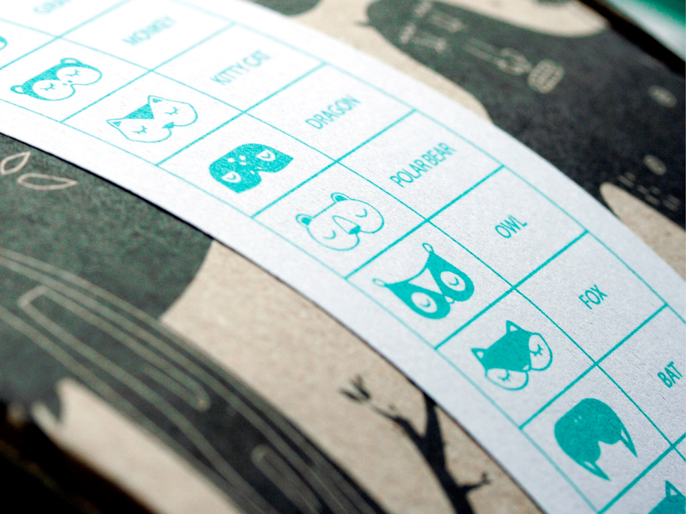 Маски находятся в картонной коробке-подушке, которая украшена смелыми иллюстрациями и обернута бумажной лентой-этикеткой, на которой изображено всё семейство масок-животных.