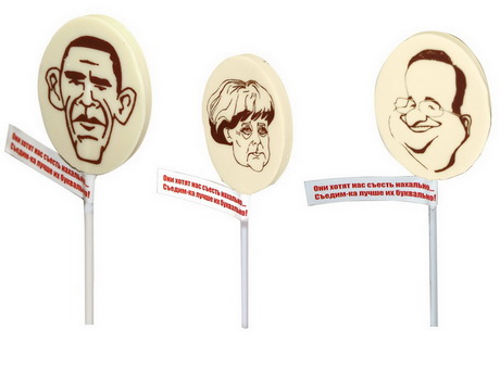 Изобретательность продавцов необычных шоколадок не ограничилась одними только изображениями. На этикетках конфет маркетологи разместили патриотические надписи: «Они хотят нас съесть нахально, съедим-ка лучше их буквально». Кстати, цена съедобного Барака Обамы совсем не демократическая. Чтобы попробовать президента США на вкус, придется выложить порядка 90 рублей.
