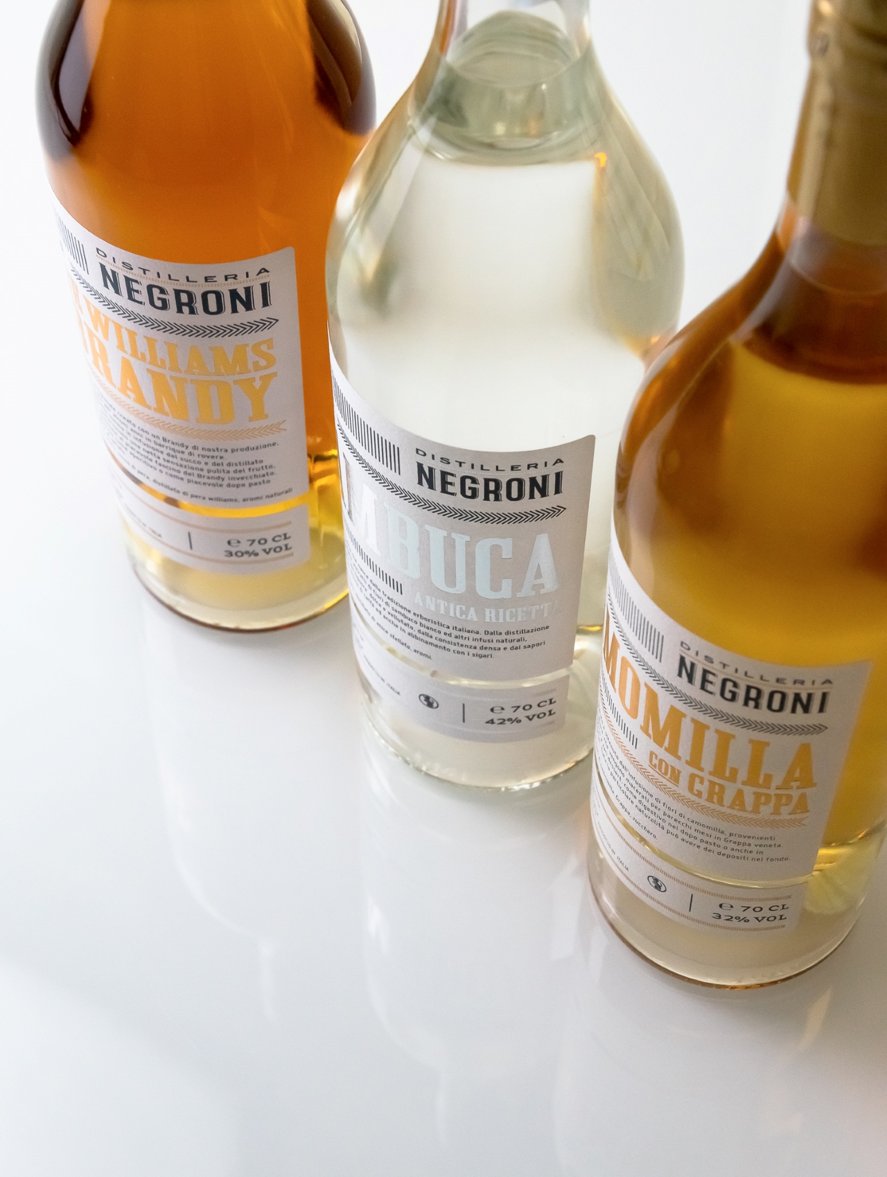В линейку ликёров вошли три продукта: Pere Williams e Brandy, Camomilla con Grappa и Sambuca. Целью проекта было освежить визуальную айдентику спиртного, создав элегантный, современный дизайн, который отражает премиум-качество и мастерство производителя.