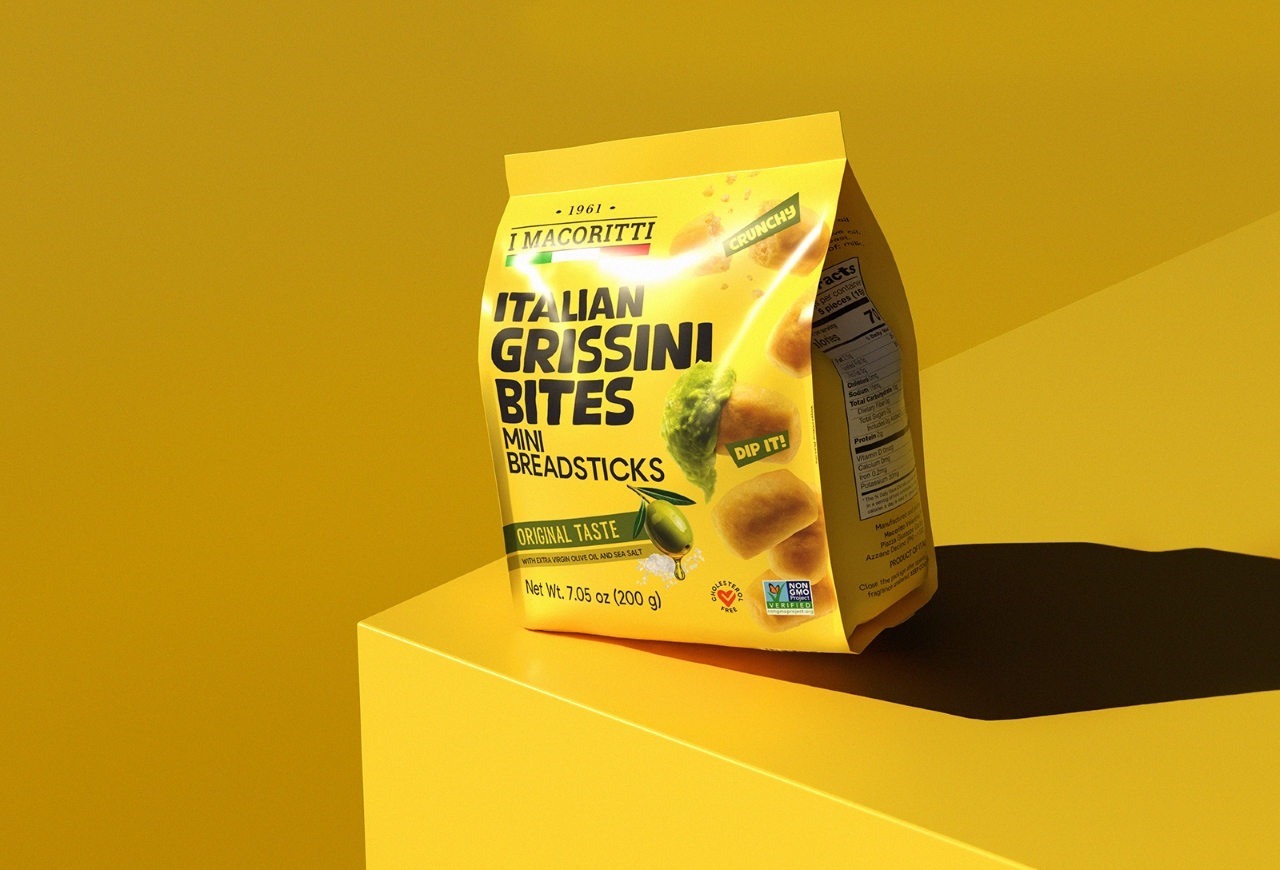 Палочки гриссини Macoritti — это флагманский продукт компании Macoritto Valentino, который любят за хруст, лёгкость и игривый характер. Для американского рынка предстояло создать упаковочную систему, которая может перевести аутентичность этих итальянских гриссини в визуальный язык, который откликается у американских потребителей. Целью было создать линейку, выделяющуюся на тесных прилавках супермаркета, передав при этом итальянское наследие продукта и его качество.