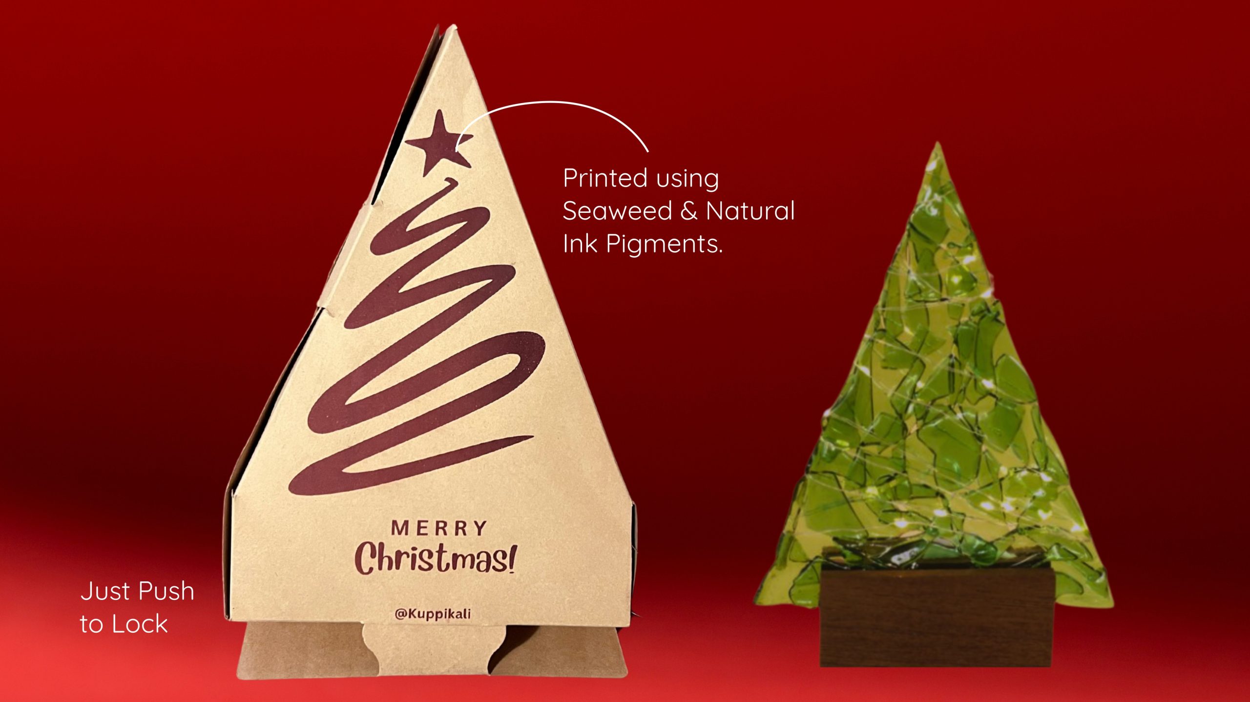 Рождественская лампа Kuppikali — это не простой продукт. Она изящна, пластична и символична. Производится она из переработанных стеклянных пивных бутылок, а потому заслуживает такой же продуманной упаковки, как и сам подарок. Для улучшения впечатления от распаковки и защиты хрупкой лампы, дизайнеры разработали упаковочную систему, которая также нарочито экологична, как и продукт внутри неё.