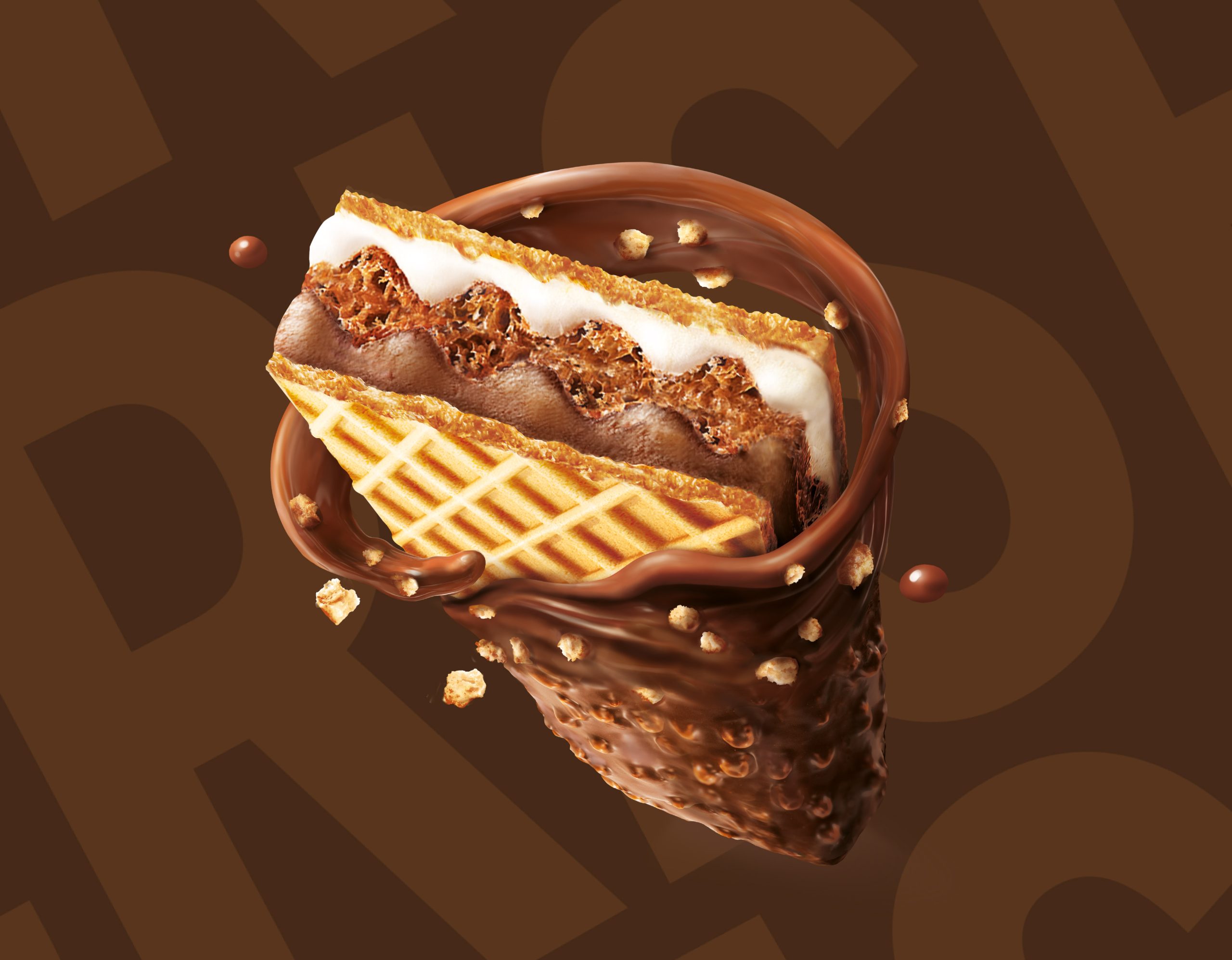 Этот вкус невозможно забыть, он одновременно насыщенный и притягательный. Хрустящая оболочка из злаков и шоколада словно приглашает сделать первый укус, чтобы открыть нежную, рассыпчатую структуру вафельного слоя. После наступает момент двойного удовольствия от молочного и орехового крема, за которым следует финальный аккорд в виде звонкого хруста хрупкого вафельного центра.