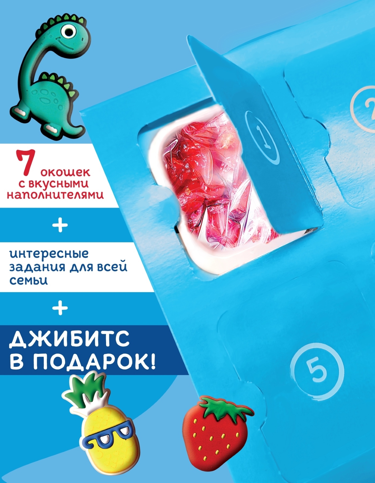 Среди топингов представлены сублимированная клубника, сушеные абрикосы, молочный шоколад, цукаты, малиновый джем, облепиховое варенье и другие сладости. На оборотной стороне картонного окна написано небольшое игровое задание на день — например, «принять ванну».