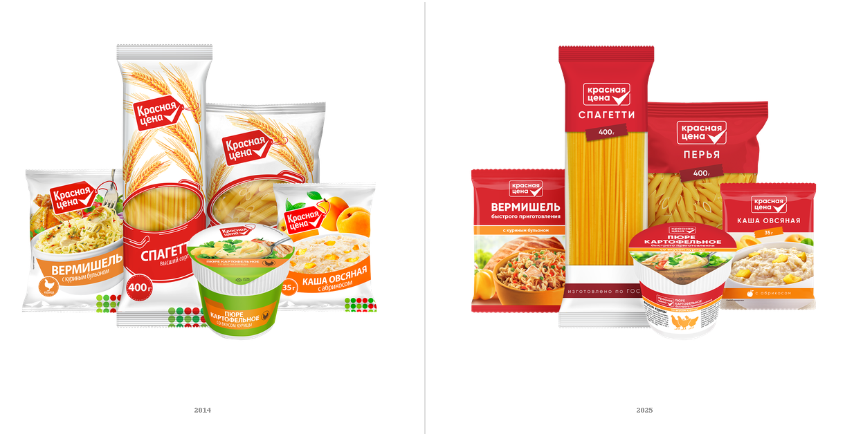 Редизайн бережно сохраняет ДНК бренда, чтобы постоянные покупатели распознали «Красную цену» с первого взгляда. Айдентика стала современнее и дружелюбнее: обновлены композиционные приемы, типографика и принципы работы с цветом, чтобы лучше читаться на полке и в диджитале.