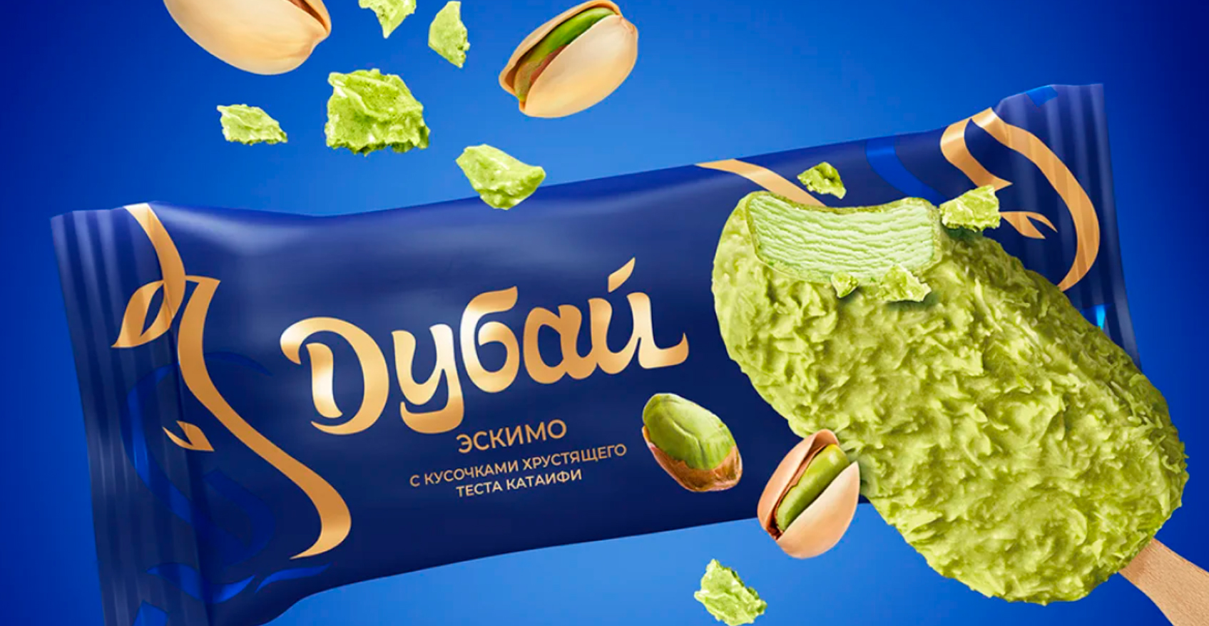 Когда бренд создает продукт с уникальной рецептурой, дизайн должен не просто рассказывать о нем, а передавать ощущение вкуса. Так появилась идея для мороженого «Дубай» от BREMOR — эскимо с кусочками хрустящего теста катаифи, вдохновлённого атмосферой города, где сочетаются роскошь, стиль и традиции.