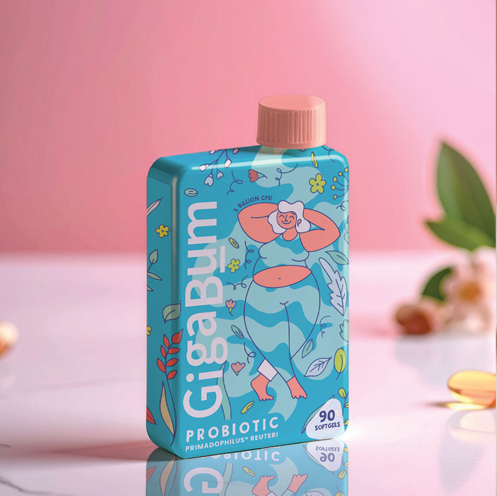 Название Gigabum представляет собой комбинацию слов Giga и Bum, что отражает ироничную уверенность бренда. А нежная палитра голубого, розового и желтовато-зелёного выделяет продукт на фоне стерильных белых упаковок, традиционных для фармацевтического сектора, пишет Upakovano.ru. Gigabum не стесняется говорить о пищеварении. Он делает это с самоиронией и улыбкой, ведь забота о здоровье может быть не только полезной, но и весёлой.