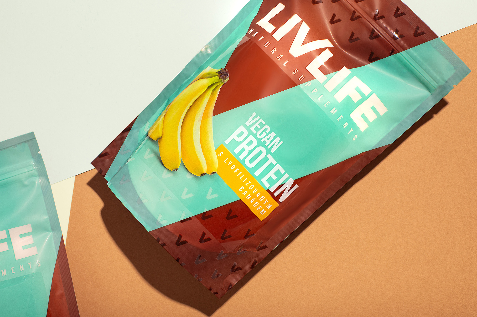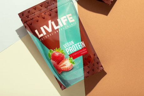 Веганские протеиновые батончики Liv Life — это глоток свежего воздуха в категории растительного питания. Дерзкое диагональное соединение цветовых блоков и крупная типографика ломают привычные стереотипы в категории спортивных добавок. Контраст бирюзового и ржаво-коричневого цветов создаёт яркое визуальное присутствие на полке, а крупная надпись «VEGAN PROTEIN» напрямую обращается к флекситарианцам (нестрогим вегетарианцам) и приверженцам растительного питания, ищущим удобный источник энергии.