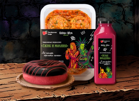 Лимитированная линейка собрана так, будто все персонажи вселенной встретились за одним столом. В меню — «Пирог любимой жены», «Древлянская каша» и «Хардкорная уха», «Ужин колдуна» и «Пиратский минтай», «Ёжик и молния» и драники «Хой!».
