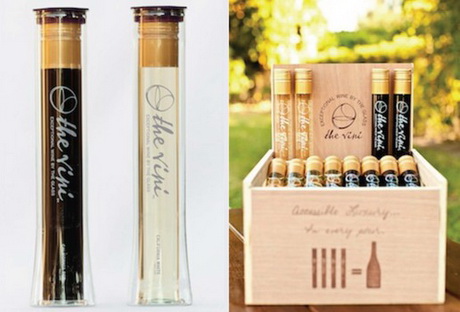 Рассмотрим недавно появившиеся разработки в мире порционных упаковок для вина, которые помогают потребителям в осуществлении желаний. Первый образец, стеклянная туба, не должна была стать порционной упаковкой для вина, однако её размер и дизайн просто настаивает на том, чтобы использовать «на ходу». Упаковка The Vini представляет собой стильную стеклянную тубу с 187 мл вина, что равняется одной четвертой стандартной бутылки вина. Этот вид контейнера создаёт ощущение изысканности и уникальности.