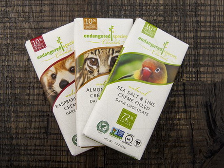 Шоколад делает нас счастливыми и повышает настроение, а благодаря шоколаду Endangered Species счастливой становится и наша планета. Цепляющее оформление шоколадной плитки, позволяющей заглянуть в глаза животного, говорит о том, что внутри кроется нечто удивительное. 10% всех доходов от продаж шоколада идёт в фонды по сохранению видов животных и среды обитания. Внутри обёртки можно найти интересную информацию о животных. Компания настолько привержена экологии, что занимается переработкой использованных шоколадных обёрток.