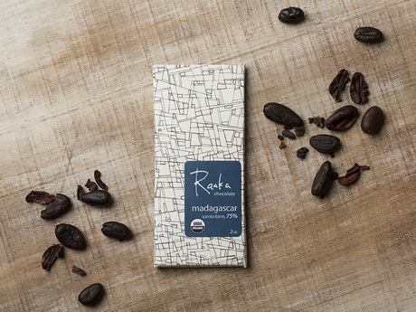 Шоколад Raaka готовится из размолотых жерновами нежареных какао-бобов. Дизайн упаковки стал совместным творчеством между бруклинской компанией Raaka и дизайнерской фирмой Loop. Оформление упаковки чествует ретро-современные влияния природы и архитектуры. Наброски, органические и линейные формы наносятся на экологически чистую бумагу из вторсырья чернилами на основе сои. Яркие стикеры становятся необходимым цветовым акцентом.