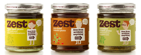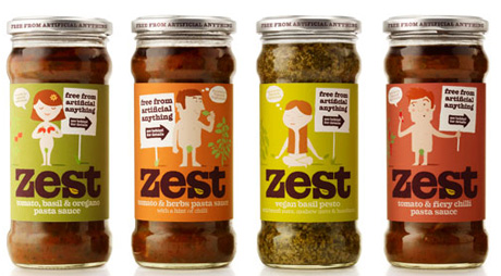 Агентство Designers Anonymous представило упаковку линейки соусов и песто для макарон марки Zest. Дизайнеры решили использовать серию наивных иллюстраций в стиле 1950-х гг. На них изображены нудисты, которые сообщают, что в продукте «отсутствуют любые искусственные ингредиенты». Мужчины и женщины скромно прикрывают свою обнаженность ключевыми компонентами соуса, пишет Upakovano.ru.