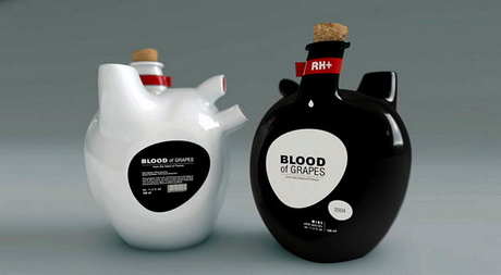 Подшучивая над вегетарианцами, мясоеды частенько говорят, что те едят плоть убитых овощей и пьют кровь умерщвленных ягод и фруктов. По той же аналогии, вино можно назвать кровью невинного винограда. Как раз ею и воспользовался дизайнер Константин Болимонд (Constantin Bolimond), разрабатывая дизайн необычной бутылки для вина Blood of Grapes.
