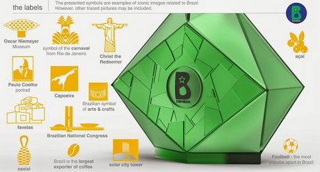 Форма бутылки навеяна флагом страны, гениальными геометрическими узорами, а также полигональными очертаниями традиционного музыкального инструмента кашиши. Матовое стекло олицетворяет песок, а зелёный цвет — свежесть. В оформлении использованы изображения, являющиеся самыми известными символами Бразилии. Здесь можно увидеть и силуэт капоэйриста, и портрет Паоло Коэльо, и символ кофе, и статую Христа-Искупителя, и многое другое.