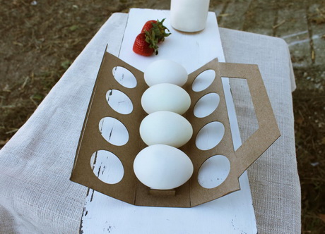 Что касается самой упаковки, она изготовлена их одного куска стандартного макулатурного картона. Для его сборки не используются клеящие вещества. Лишь на одной стороне упаковки присутствует тиснение. Конструкция удерживается вместе с помощью язычков, которые также удерживают каждое яйцо на своём месте. Это простая упаковка, которая помогает фермеру быстро собрать и расфасовать яйца.