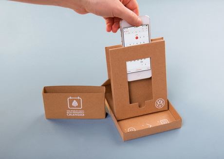 Для налаживания отношений со своими ключевыми клиентами, штатом продавцов и новыми партнёрами компания Volkswagen дарит им сувенирную продукцию. В этом году дизайнерам пришла в голову идея создать вечную подставку для телефона, который и становится календарём. Так родился самый экологичный в мире календарь, который на 99,9% изготовлен из переработанного материала. Оставшийся 0,1% приходится на производство и транспортировку продукции.