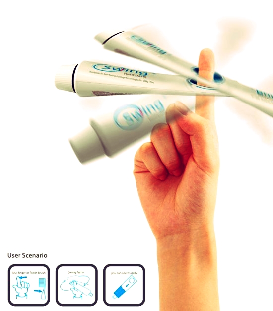 Создатели этого концепта уверены, что настала новая эра для всех, кто пользуется зубной пастой. Теперь, чтобы добыть ее остатки не надо даже применять усилия. Достаточно надеть тюбик на палец и хорошенечко его раскрутить, — под действием центробежной силы все содержимое переместится к носику.