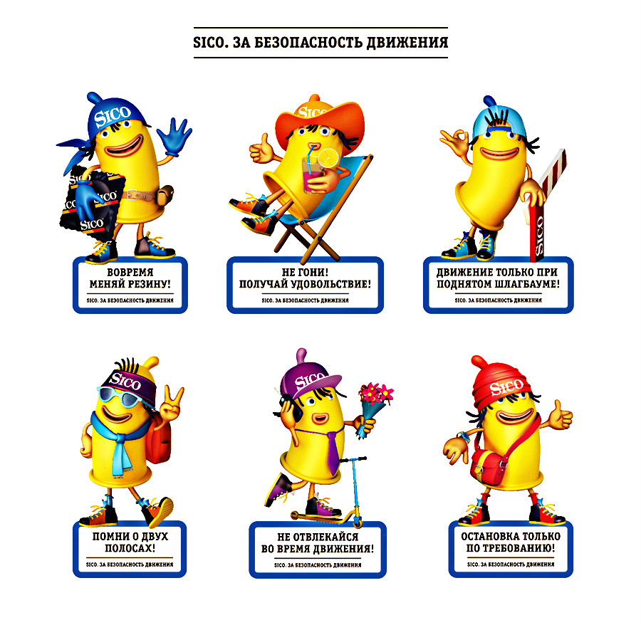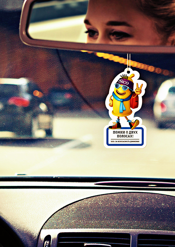 Креаторы создали креативную концепцию продвижения презервативов SICO при помощи BTL-рекламы для того, чтобы привлечь соответсвующую целевую аудиторию автолюбителей. Именно поэтому кампания получила такой двузначный слоган: «SICO. За безопасность движения». Автомобильные освежители креаторы изобразили в виде оригинальных бренд-персонажей и добавили забавные «дорожные» подписи к ним.