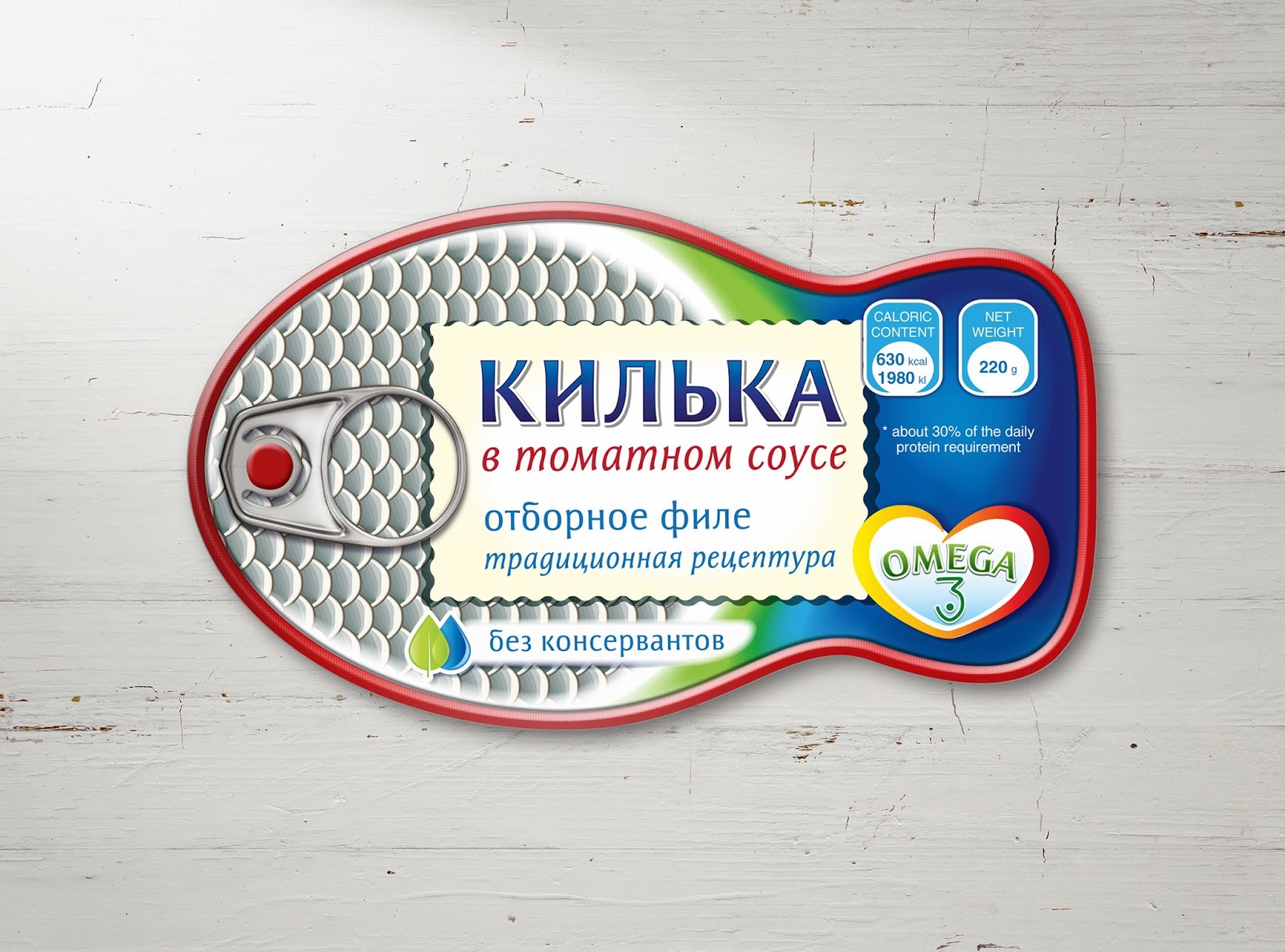 Фоновое оформление дополняет образ с помощью рыбных чешуек, пишет Upakovano.ru. Разные цвета краёв банок гарантируют быструю идентификацию нужного продукта потребителями.