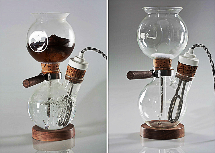 Эта кофеварка, с дизайном в духе лабораторного антуража, работает по принципу кофеварок Cona, с тем только отличаем, что использует электричество вместо газа и варит кофе в три раза быстрее. Остальные же радости — зрелищность, неповторимый аромат, сопутствующие звуки, — все при ней.