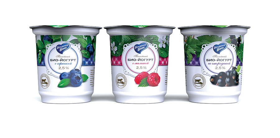 В силу специфики продукта (послойные ягодные биойогурты с коротким сроком хранения) существующая айдентика торговой марки «Искренне Ваш» претерпела значительные изменения для того, чтобы эффективно «продать» как вкусовую составляющую, так и натуральность продукта.