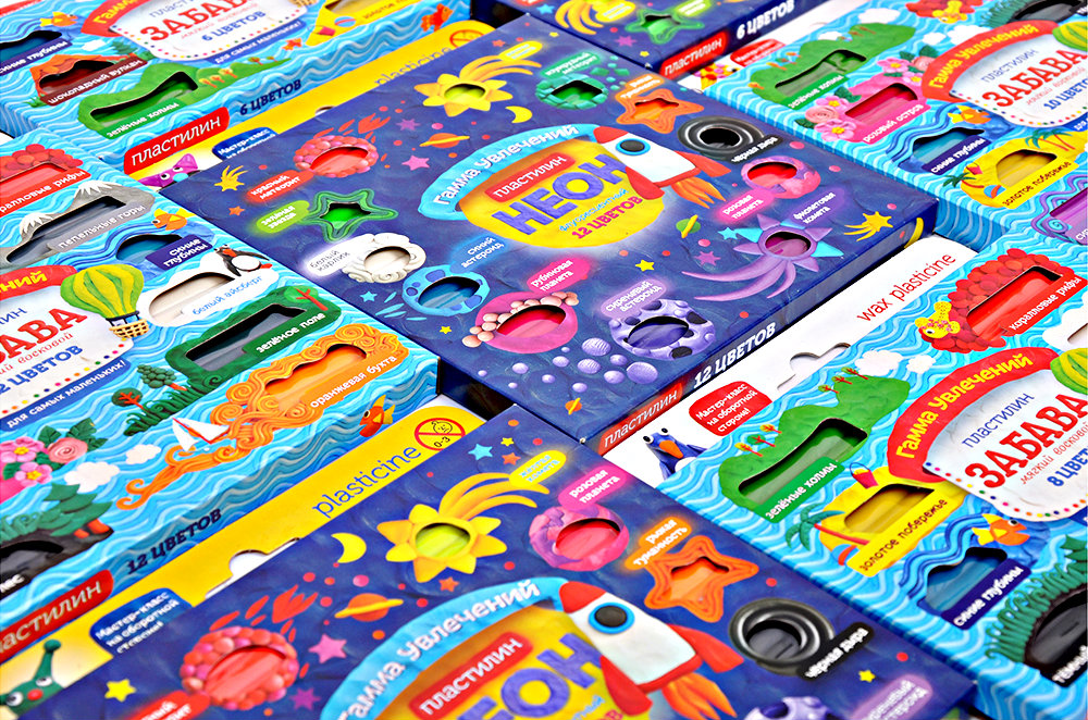 Упаковки должны выделяться на полке, а также наглядно демонстрировать покупателям преимущества этого пластилина.