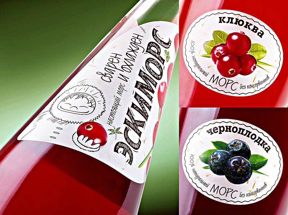 Торговая марка «Эскиморс» российского производителя «Мегапак» — это освежающие безалкогольные напитки из лесных ягод. Слоган «Сварен и охлажден», разработанный брендинговым агентством BQB, подчеркивает позиционрование продукта как исключительно натурального, а поэтому полезного для взрослых и детей. Дизайн логотипа и фигурной этикетки также был создан командой BQB.