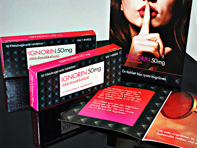 Ignorin — это первые таблетки безрецептурного отпуска в Швеции, которые уменьшают боль от мигрени с помощью противовоспалительного диклофенака. Агентство Bakerscape получило задание от компании Actavis разработать дизайн и основную идею нового бренда. Предполагалось, что марка Ignorin должна была привлечь, в первую очередь, женщин. Идеальным образом целевого потребителя стала молодая Хиллари Клинтон — профессиональная, но женственная.