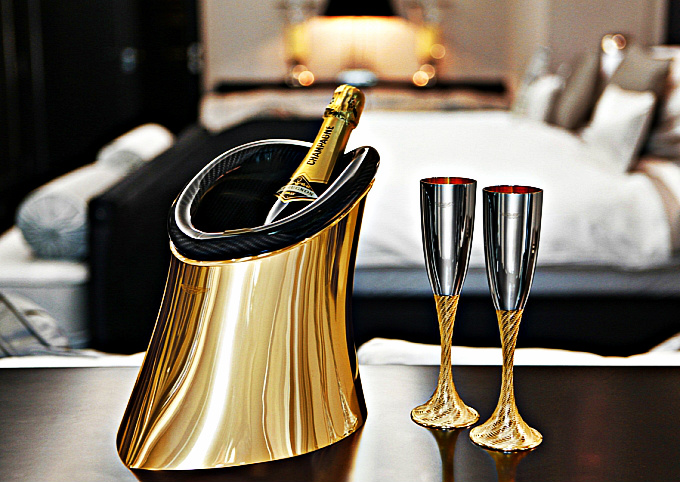 Если вы считаете, что ведёрко для охлаждения бутылок от Porsche, сделанное из старого цилиндра двигателя, слишком нарочито, значит вы ещё не слышали о лимитированной серии ведёрка для льда Aston Martin. Этот продукт более эксклюзивен, чем автомобиль, вдохновивший на его создание. Супер-люксовое ведёрко для льда навеяно линиями лимитированной серии суперкара Aston Martin One-77. Оно изготовлено из чистого серебра 925 пробы и листового золота в 24 карата.