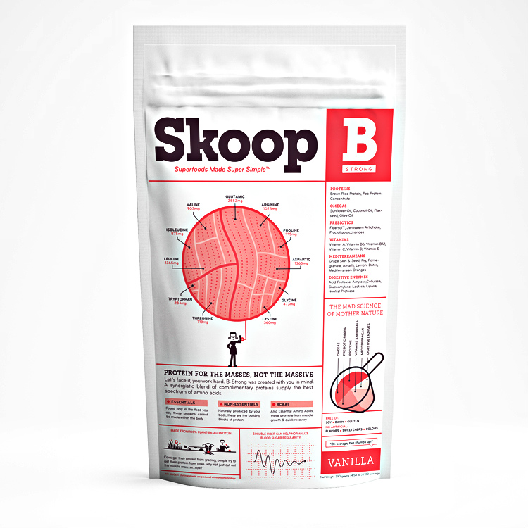 Дизайнерское агентство Good Apples завершило работу над созданием бренда, системы идентификации и упаковки для продукции Skoop. Это семейство растворимых напитков из супер продуктов питания, разработанных Алексом Богуски и другими людьми, создававшими компанию Izze and Mix1. Данная продукция позволяет каждому получить энергию, жизненную силу и питательные вещества продуктов питания с особыми свойствами.