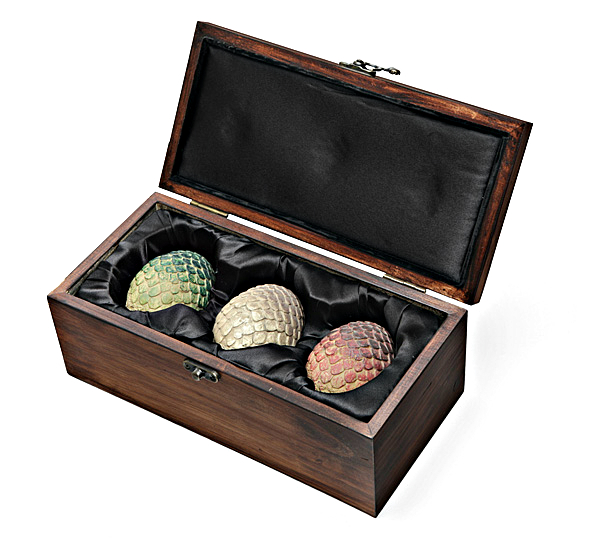 Если вы являетесь ярым фанатом сериала канала HBO «Игра престолов», четвёртый сезон которого стартовал на телевидении, или пытаетесь сойти за такового, вам просто необходимо познакомиться с коллекционным подарочным набором драконьих яиц Game of Thrones Dragon Eggs Collectible Set. Этот набор представляет собой миниатюрную версию яиц, ставших подарком для Дейенерис Таргариен на свадьбу с вождём кочевников-дотракийцев кхалом Дрого.