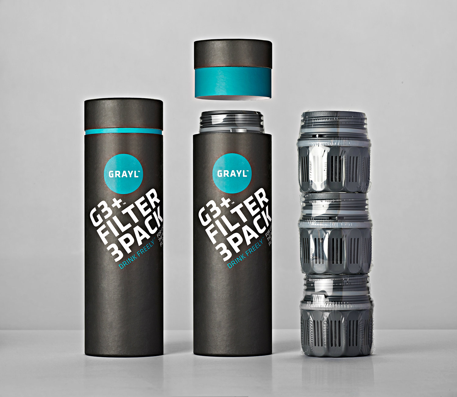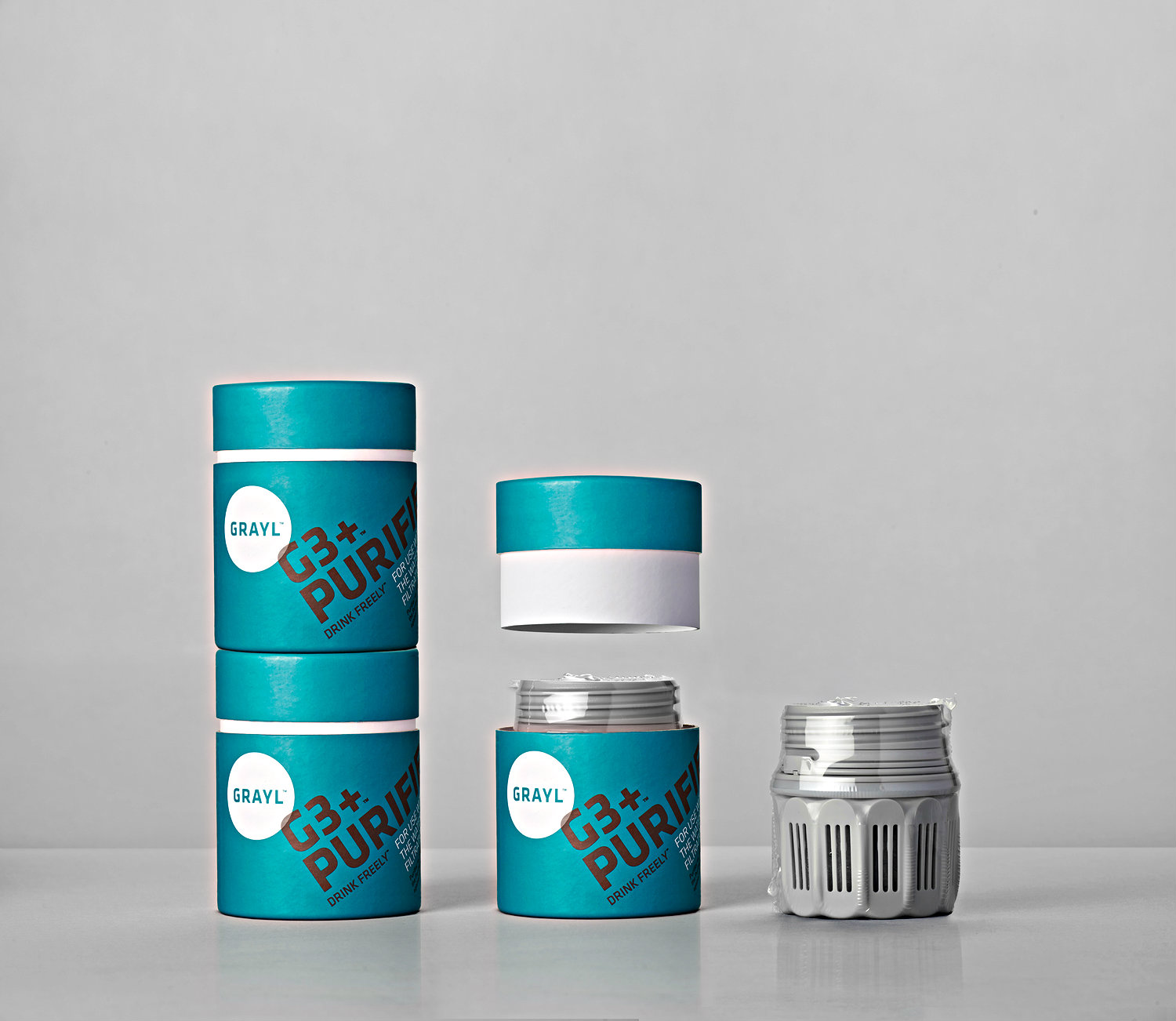 Инновационный фильтрующий стакан GRAYL работает как кофейный пресс с технологией фильтрации G3+ (первоначально разработанной для NASA). Он позволяет удалять химикаты, тяжёлые металлы и бактерии. Дизайнерская студия Turnstyle черпала вдохновение из элегантного и минималистского дизайна стакана, создавая для него цилиндрическую упаковочную систему. Фирменная пломба стакана между внутренним цилиндром и внешним цилиндром повторяется в цветной полоске между корпусом упаковки и её крышкой.