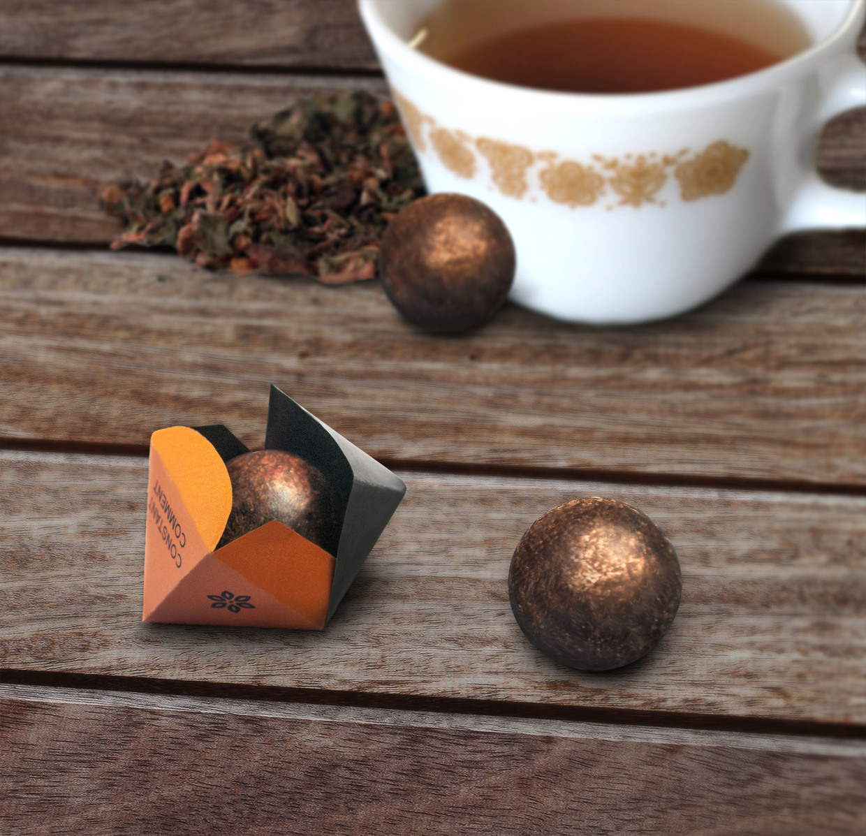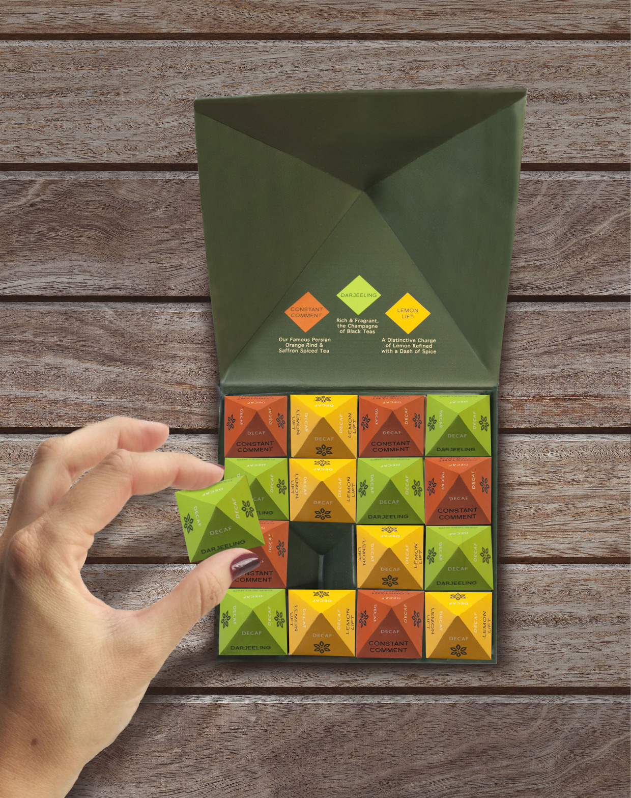 Инновационный концепт Уилсон построен на идее о том, что фирменные чаи Bigelow выпускаются в форме растворимого порошка, принявшего сферическую форму, пишет Upakovano.ru. Эти простые в использовании чайные шарики упакованы в отдельные цветные кубы, олицетворяющие три вкуса, входящие в подарочный набор: Constant Comment, Darjeeling и Lemon Lift.