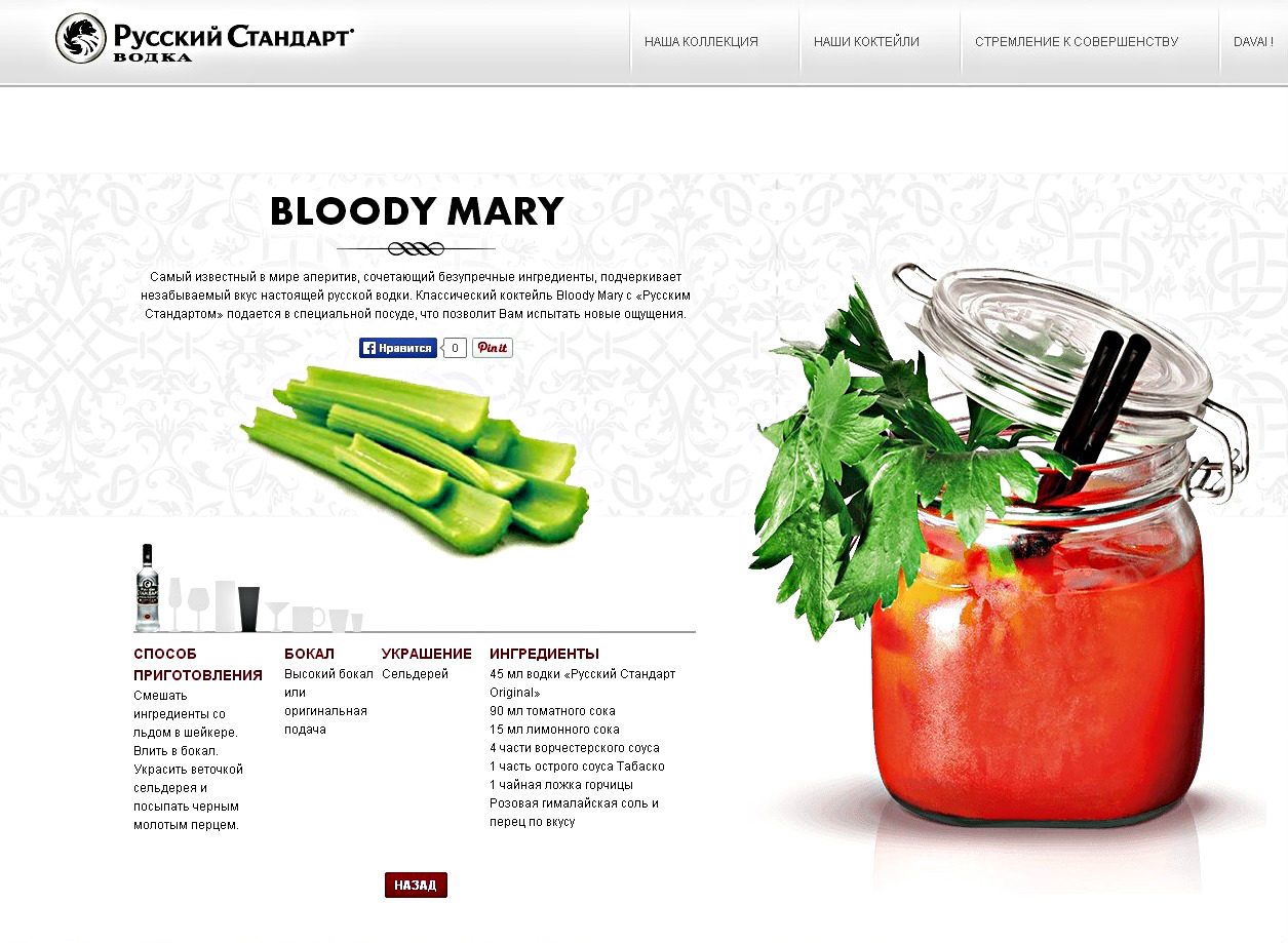 Стильный и современный сайт «Русского Стандарта» подробно знакомит потребителя с ассортиментом премиальных брендов и тонкостями всех этапов производства: от выбора ингредиентов до передовых технологий, используемых на самом современном водочном заводе в России. Для удобства потребителя на сайте также представлены рецепты фирменных коктейлей, разработанных лучшими миксологами компании.