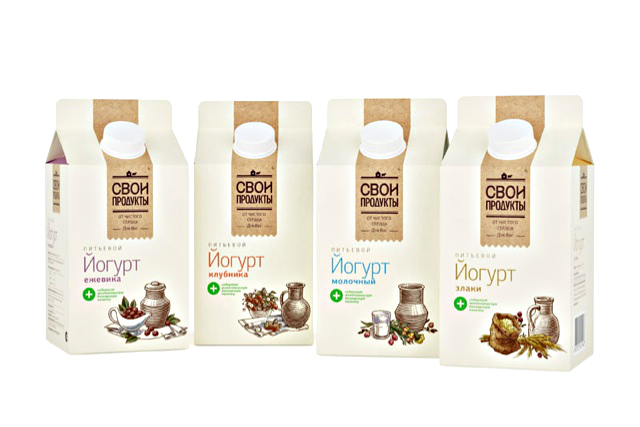 Приглушенные натуральные оттенки позволяют продукту выделяться на полке среди аналогов, чаще всего окрашенных в яркие цвета. Пасторальные изображения в технике гравюры придают упаковке дорогой и благородный вид, вместе с тем вызывая ассоциации с классическим образом деревни, которую мы помним из рисунков в книгах или из собственного счастливого детства.