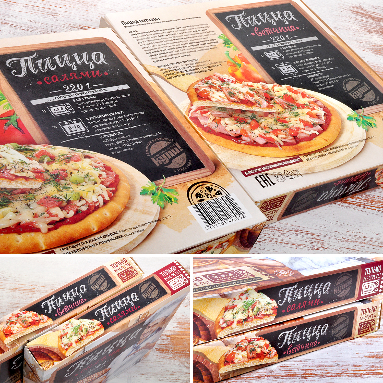 Эта линейка пицц имеет свои особенности: пицца идеально подходит по своим размерам для микроволновой печи; она приготовлена на небольшом предприятии по традиционным рецептам из натуральных ингредиентов, а ее начинка раскладывается вручную. Все это наглядно отражено на упаковке.