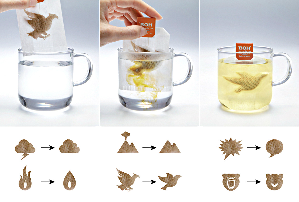Чтобы продемонстрировать успокаивающий эффект от своего ромашкового чая, малазийская компания BOH использовала съедобные краски довольно новаторским способом. Она объединилась с компаниями M&C и Saatchi Malaysia, что позволило ей нанести символы напряжённости на каждый пакетик с чаем, пишет Upakovano.ru. Пиктограммы представляли собой символы, нагнетающие обстановку, такие как гром, извергающиеся вулканы и злые медведи. Между тем, при помещении пакетика в горячую воду, изображение на нём трансформировалось в более спокойный символ.