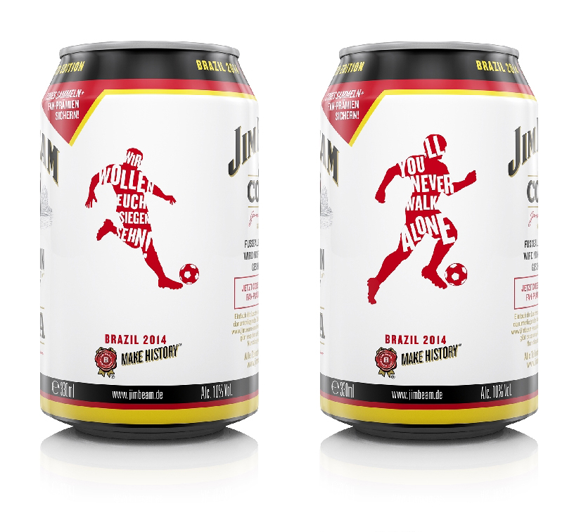 Компания Rexam в сотрудничестве с Jim Beam Germany выпустила лимитированную серию банок, посвящённую Чемпионату мира по футболу. Праздничный дизайн получили 0,33-литровые баночки коктейля Jim Beam Bourbon & Cola. Благодаря инновационной технологии Rexam Editions™ стало возможным нанести разное оформление одной этикетки на одну паллету. Новый дизайн ориентирован на футбольных фанатов, болеющих за национальную команду. На баночках изображены силуэты четырёх немецких футболистов, а также традиционные футбольные фразы на немецком языке, пишет Upakovano.ru.