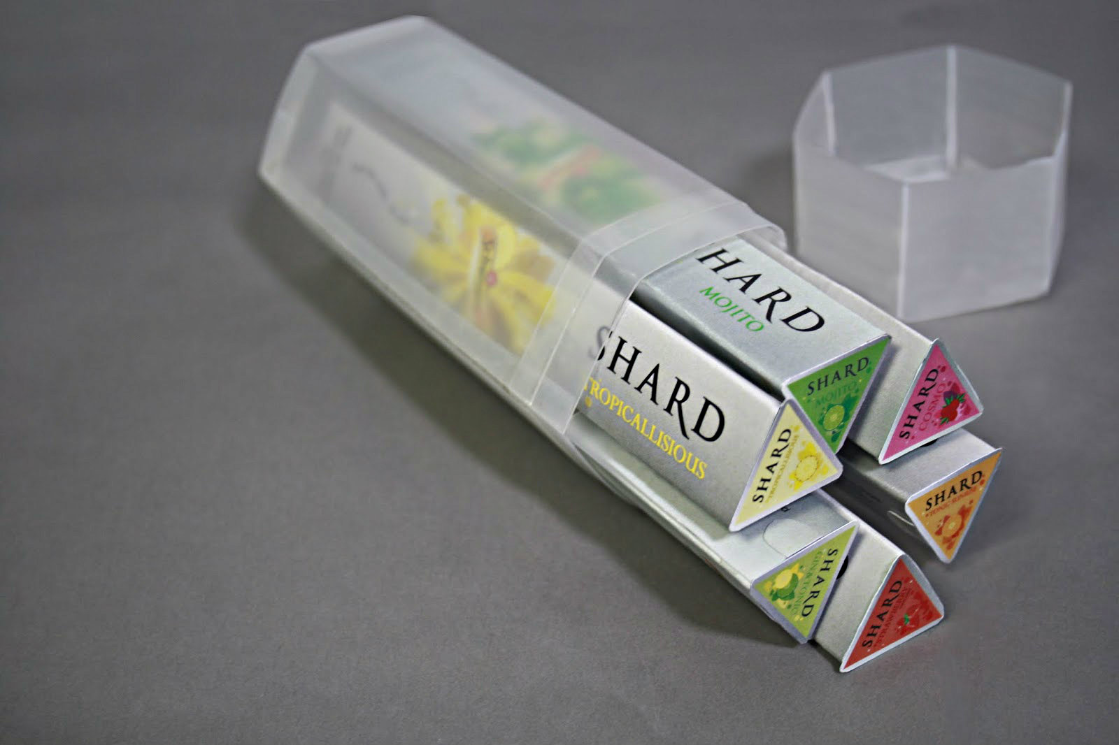 Shard представляет собой шестиугольную тубу, в которой находится сразу несколько вариантов ледяных кубиков со вкусами любимых коктейлей. Такая упаковка станет прекрасным дополнением любой вечеринки в жаркий летний день, пишет Upakovano.ru. Чтобы употреблять продукт в качестве коктейля, нужно лишь добавить алкоголь.