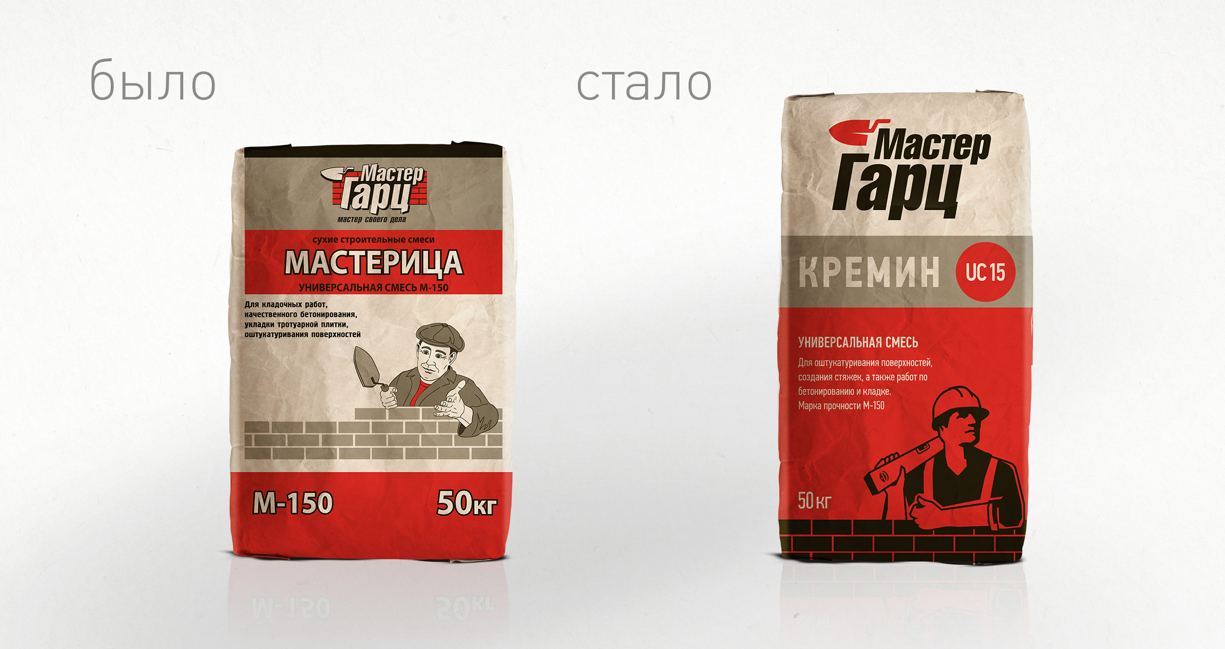 Марка существует на рынке более 10-ти лет. За это время в дизайн упаковки периодически вносились изменения и корректировки, но большее внимание производитель уделял качеству продукции. В результате дизайн перестал соответствовать и качеству продукции, и современным тенденциям на полке строительных материалов, и значительно проигрывал среди конкурентов. Необходимо было укрепить позиции марки «Мастер Гарц», как марки наиболее качественных традиционных сухих строительных смесей.