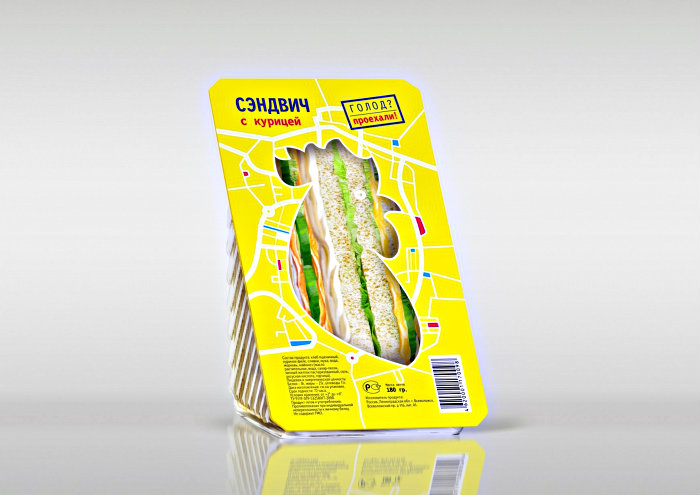 Агентство :OTVETDESIGN разработало новый бренд и дизайн упаковки для производителя сэндвичей. Креаторы отобразили в нейминге и визуальном стиле продукции тот факт, что сэндвичи — идеальная еда в дорогу. Новая торговая марка получила название «Голод? Проехали!», а на упаковке авторы проекта изобразили стилизованную карту.