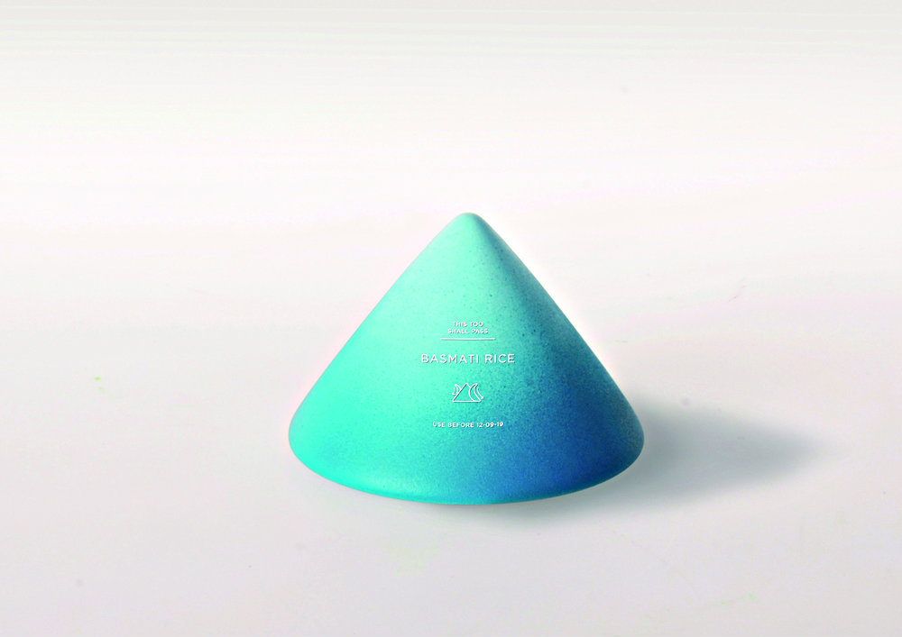 Рис Басмати обёрнут пирамидкой мягкого пчелиного воска. Печать на неё наносится чернилами на основе сои. Завершающим штрихом служит бледно-голубое напыление. Процесс открытия такой упаковки очень напоминает снятие кожуры с апельсина.