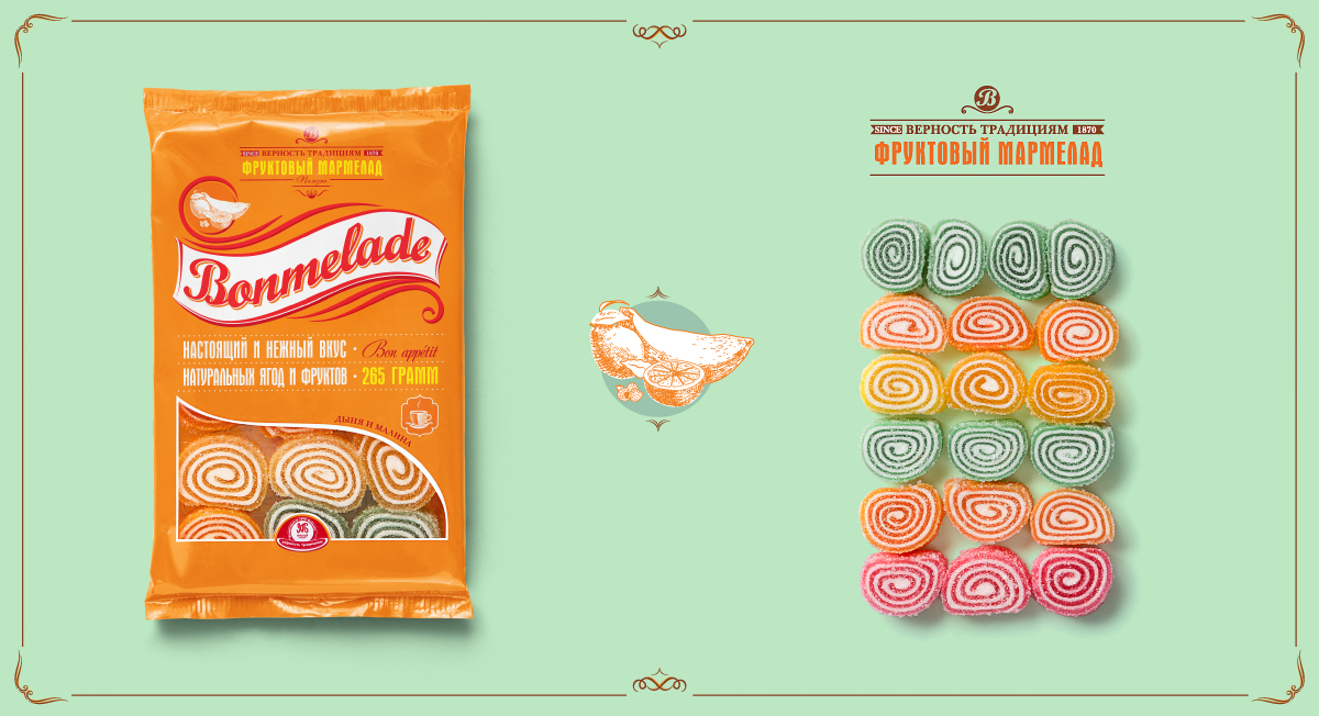 Название Bonmelade было создано путем слияния узнаваемых основ «bon» — «прекрасный, хороший» — и «мармелад». Получился фантазийный нейм, который напрямую указывает на продуктовую категорию ТМ и имеет позитивную оценочную окраску. К тому же звонкое, певучее звучание названия выгодно окутывает продукт флером французской романтики и очарования.