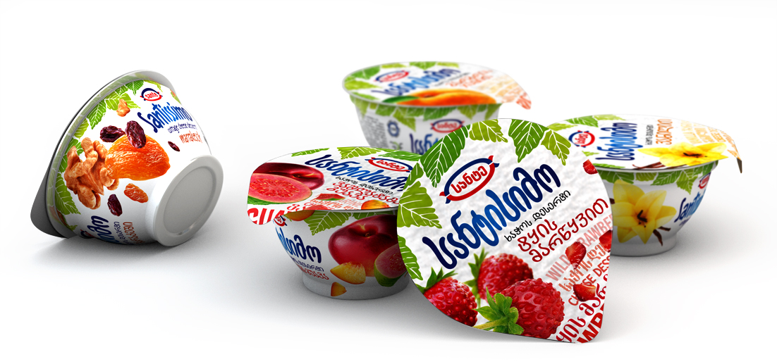 Поскольку представления об аппетитности упираются в аксиому, согласно которой всё самое вкусное — фотореалистичное, была выбрана концепция, где центральным ядром предлагался имидж фрукта/ягоды, а леттеринг с иллюстративными элементами — поддерживающим цветовым бекграундом. Графическая игра с типографикой на основе двух языков проявилась метафорой, раскрывающей сам продукт: в белой массе йогурта плавают буквы-фрукты.