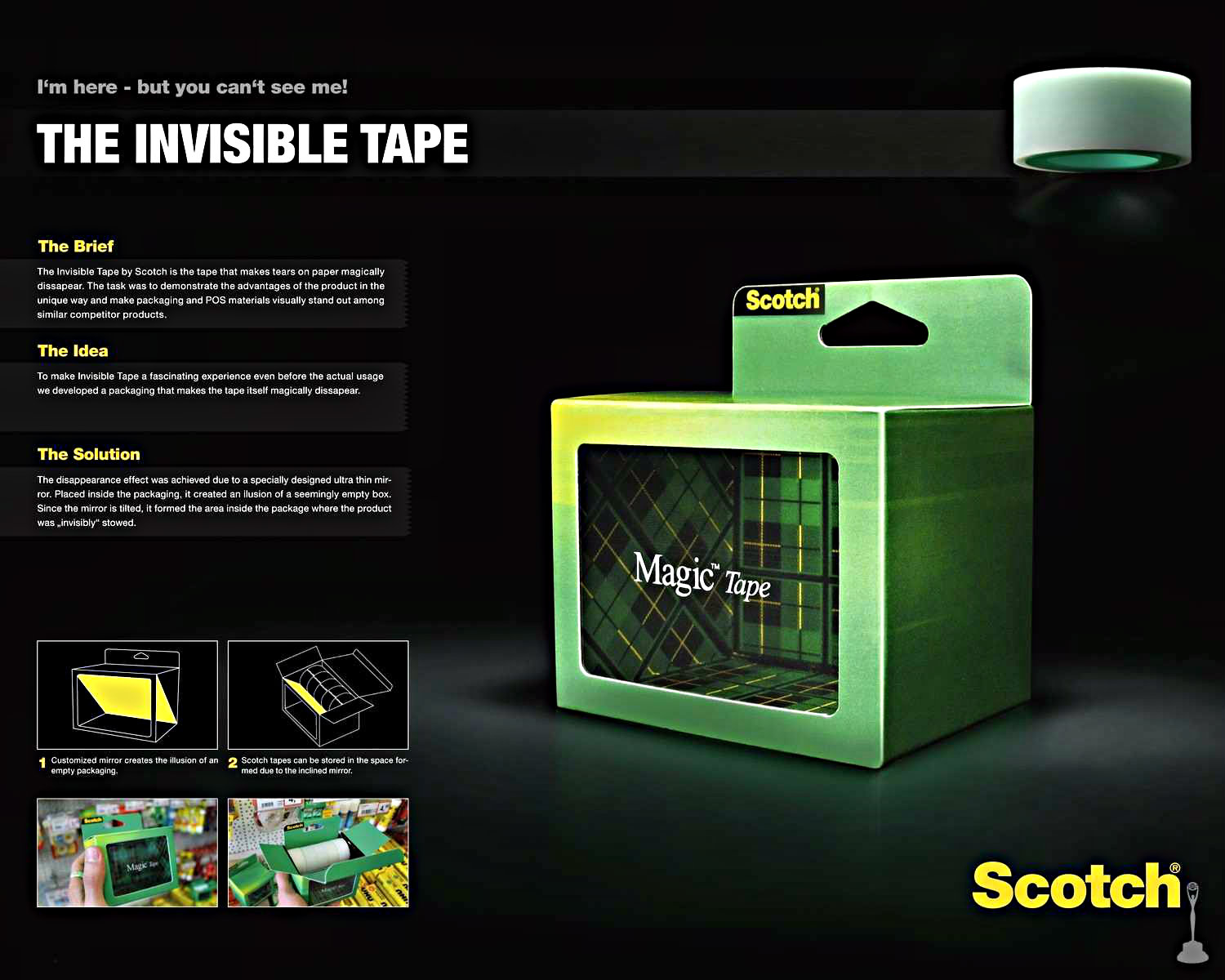 Чтобы продемонстрировать, как клейкая лента Scotch Magic Tape от 3M, словно по волшебству, склеивает бумагу, рекламное агентство из Гамбурга Kolle Rebbe разработало «умную» упаковку, которая создаёт ощущение, что лента невидима. Специалисты агентства поместили особое очень тонкое зеркало внутрь упаковки и наклонили его под особым углом. Это помогло создать пространство для размещения клейкой ленты, создав иллюзию пустой коробки, пишет Upakovano.ru.