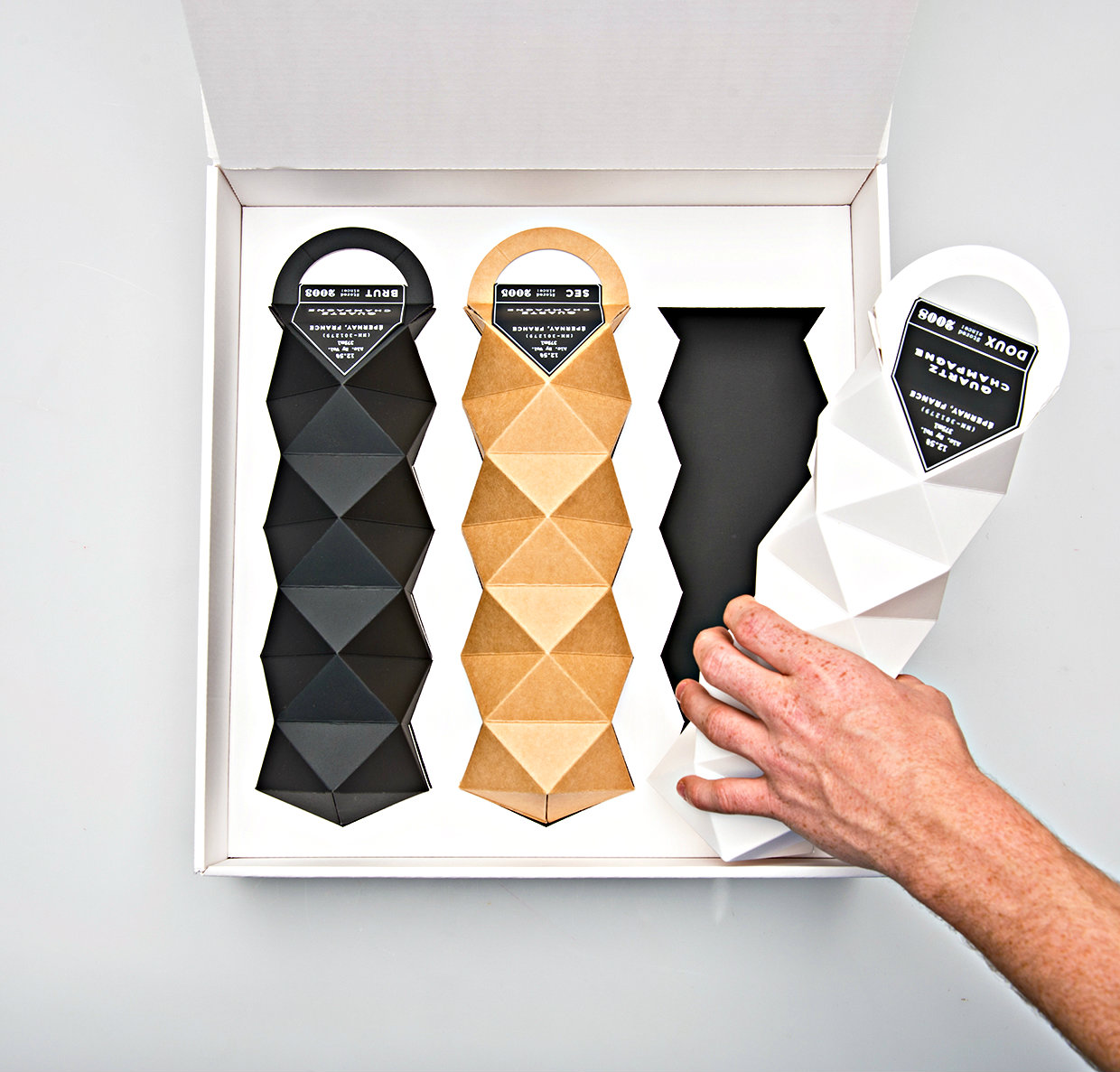 Концепт основан на желании поближе познакомиться с ремеслом. Поскольку шампанское лучше хранить в лежачем положении, дизайнеры решили использовать упаковку, которая не позволяет бутылке стоять. Это выделяет её из толпы однообразных продуктов и увеличивает экспозиционную эффективность продукта.