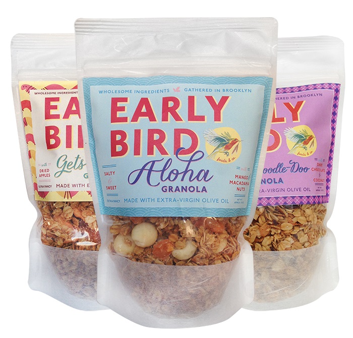 Производитель из США Early Bird Foods запускает на рынок питательную смесь для завтрака Early Bird Granola, которая состоит из полезных ингредиентов из сердца Бруклина. Выпекается смесь небольшими партиями. В прозрачные устойчивые пакеты упаковываются овсяные хлопья, покрытые мёдом. Это позволяет увидеть все ингредиенты, входящие в состав продукта, пишет Upakovano.ru.
