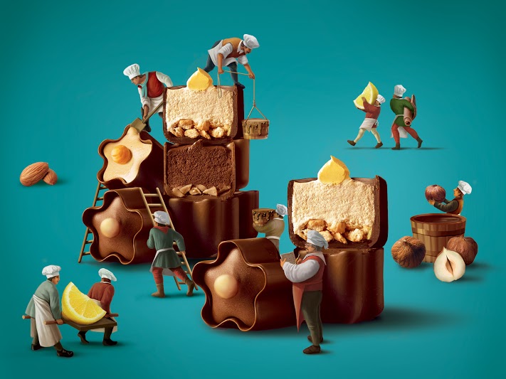 Разрабатывая дизайн упаковки новой линейки, Depot WPF сделало акцент на продуктовой зоне. Привлекательная форма конфет и необычное сочетание ингредиентов подчеркиваются с помощью персонажей, которые взаимодействуют с конфетами в увеличенном масштабе. Эта игра продолжается и на обороте, и внутри коробки, формируя цельную историю. В упаковке шоколада в плитках в центре внимания оказываются десерты.