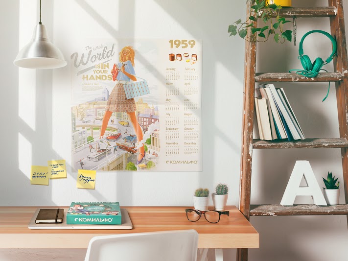 Та эпоха не так далека от нас, как кажется. Нагляднее всего об этом говорит вложенный в некоторые коробки серии винтажный календарь 1959 года. Его даты и дни недели полностью совпадают с 2015 годом.